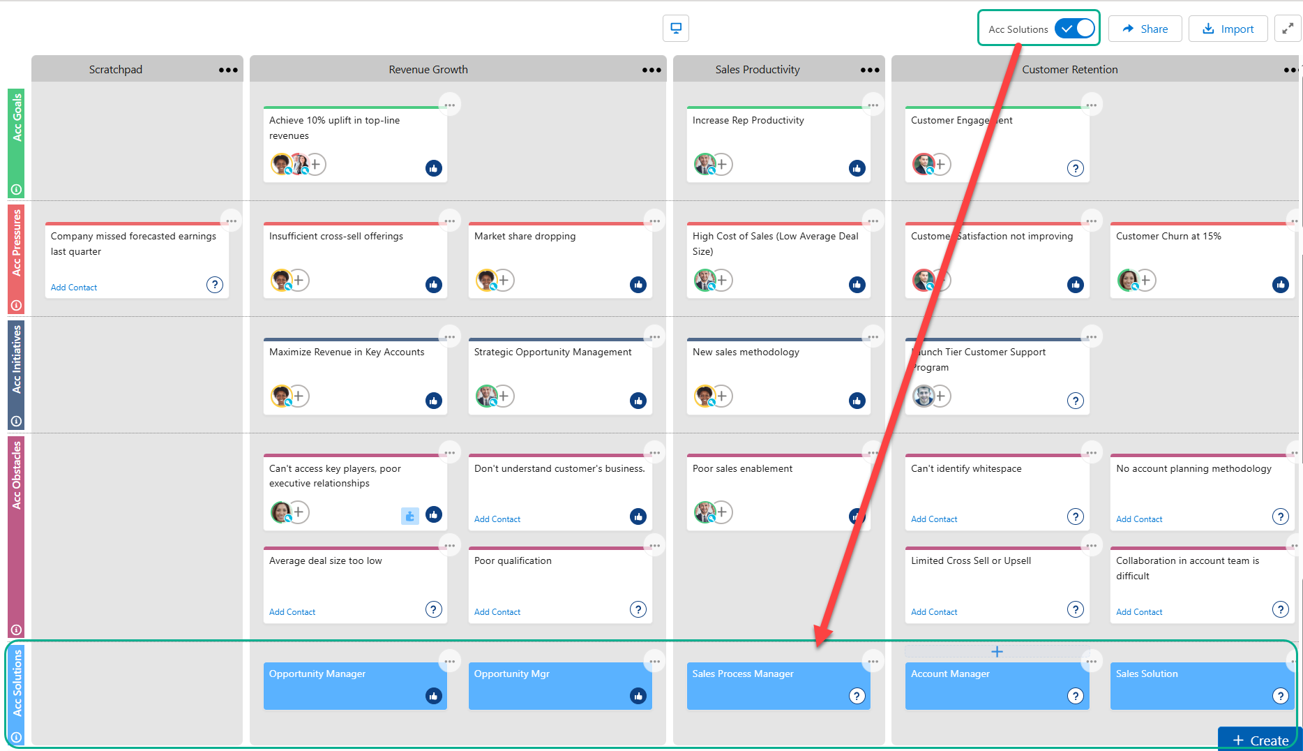 The solutions row is displayed as follows when solutions toggle is in the 'on' position (as shown in the example below on an account insight map).