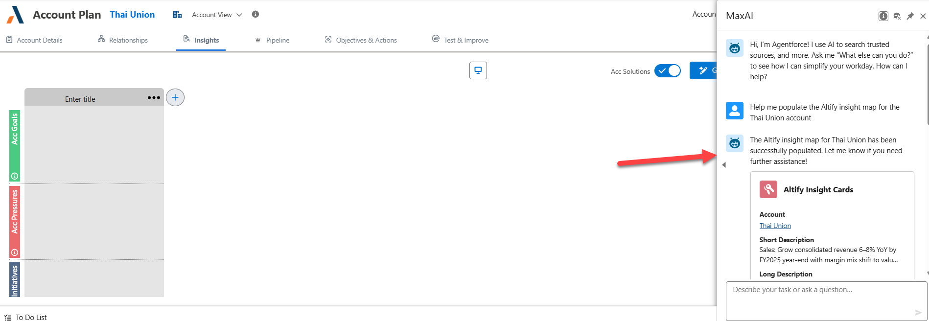 Need some assistance with unearthing insights and adding them to your insight map? Agentforce, Salesforce's AI tool is on hand (via the Altify MaxAI extension package) to identify goals, pressures and so on, and save them to your map.