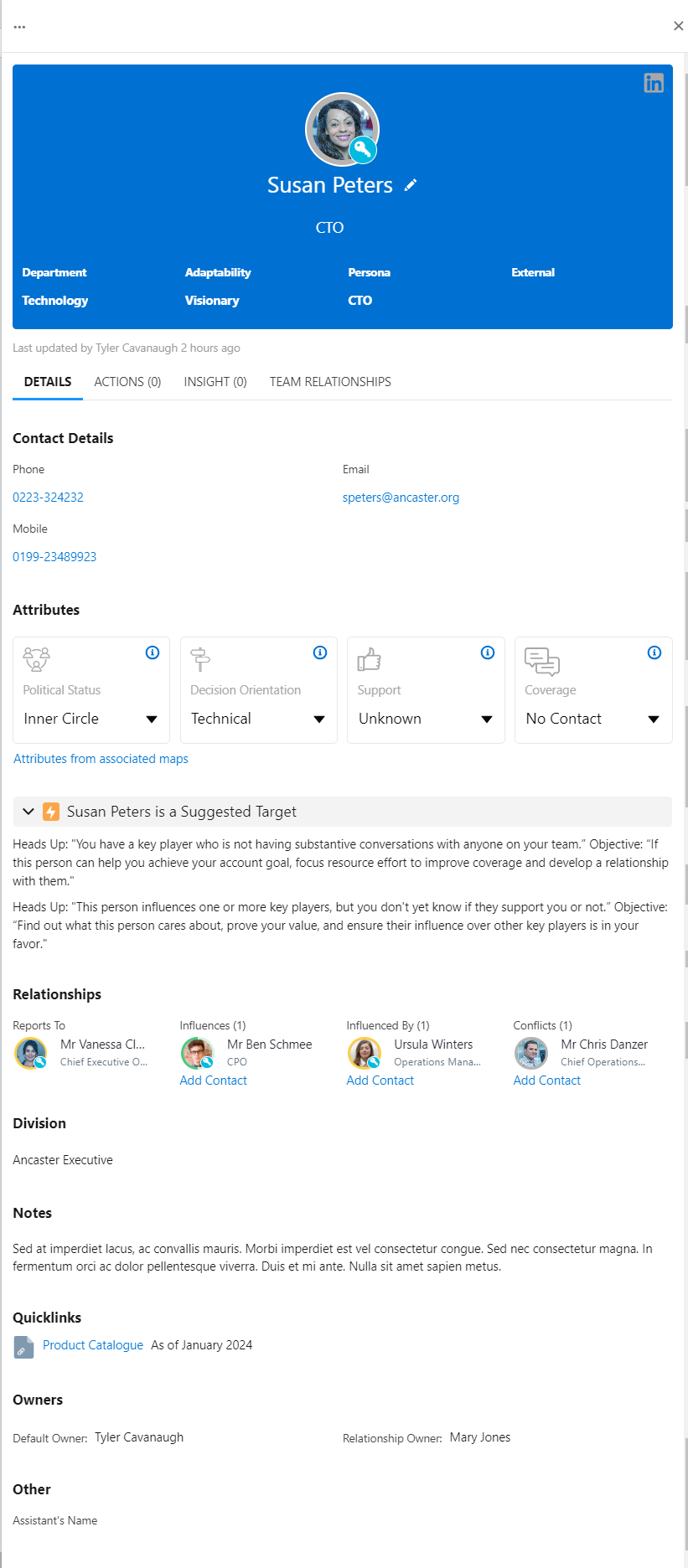 On the information panel heading you can add a contact photo, update their name and business information (title, department and persona/functional role), access their Salesforce Contact record, set the contact as external and specify an Adaptability attribute. See Information Panel Heading for further information.