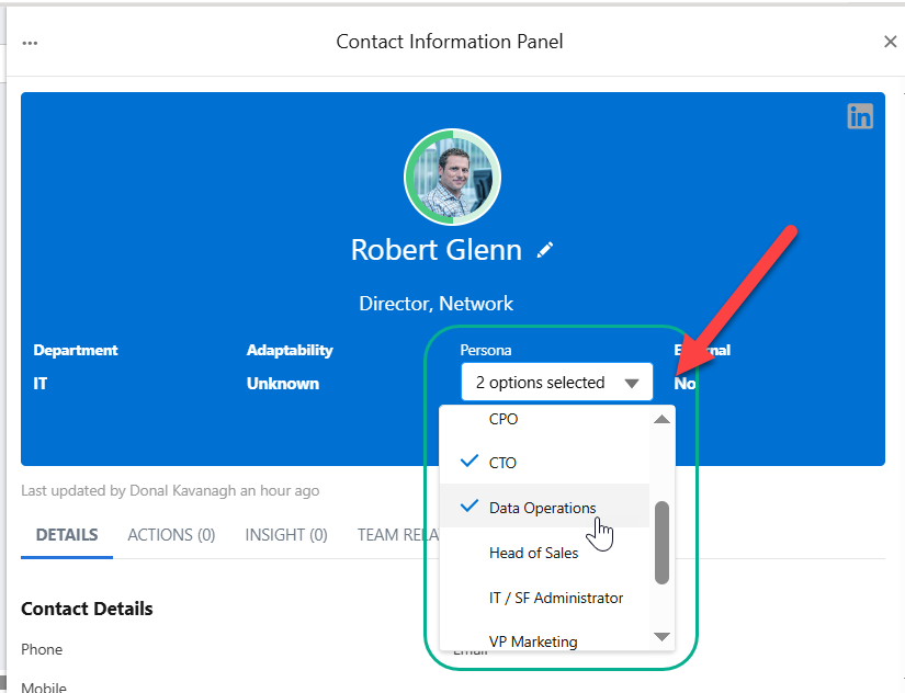 Personas are roles that are useful to include in your relationship map, such as CEO or COO. You can assign multiple personas to a contact, as shown in the example below: