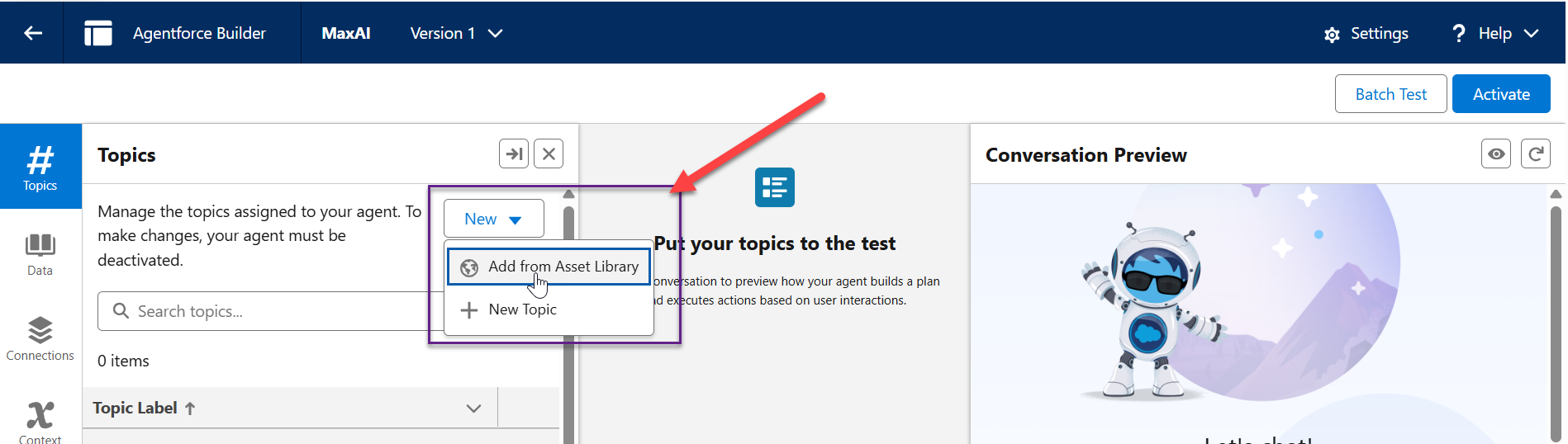 On the Agentforce Builder screen, expand the New drop-down menu in the Topics pane (as indicated below) and select Add from Asset Library.