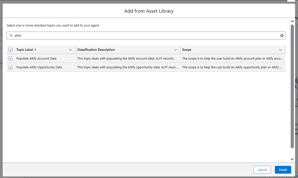 You need to manually assign the Altify topics to the employee agent you created in a previous step.