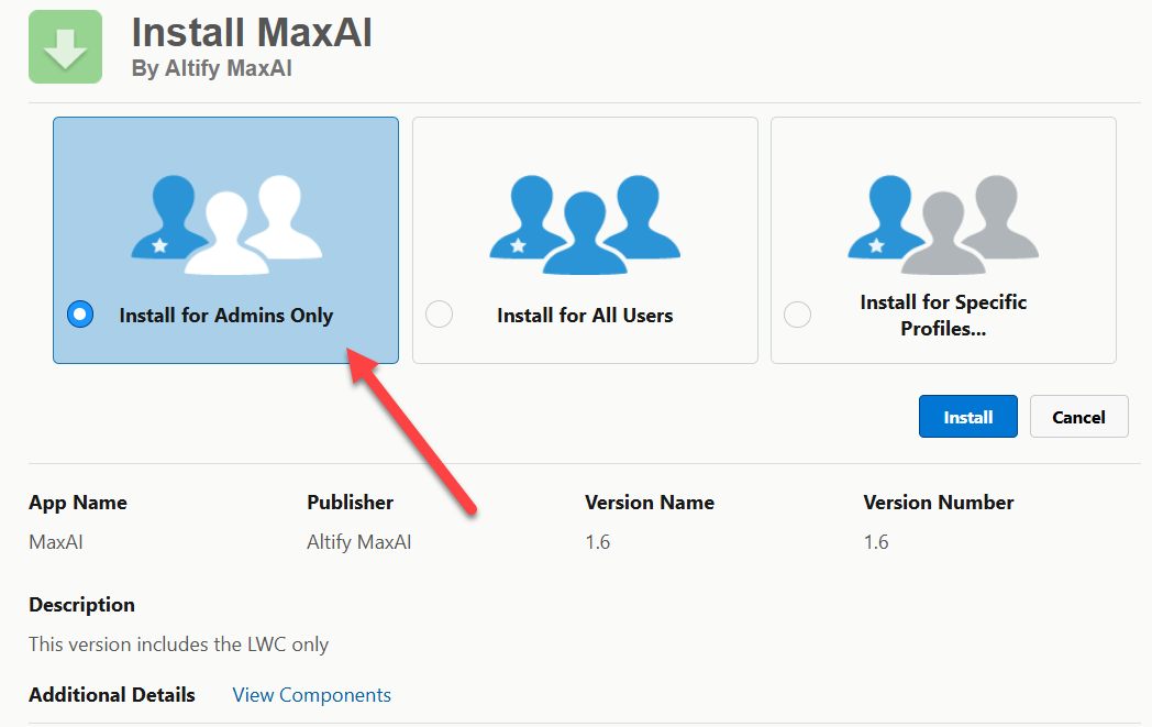 On the Install MaxAI screen, select Install for Admins only (as shown in the example below from v1.6 installation).