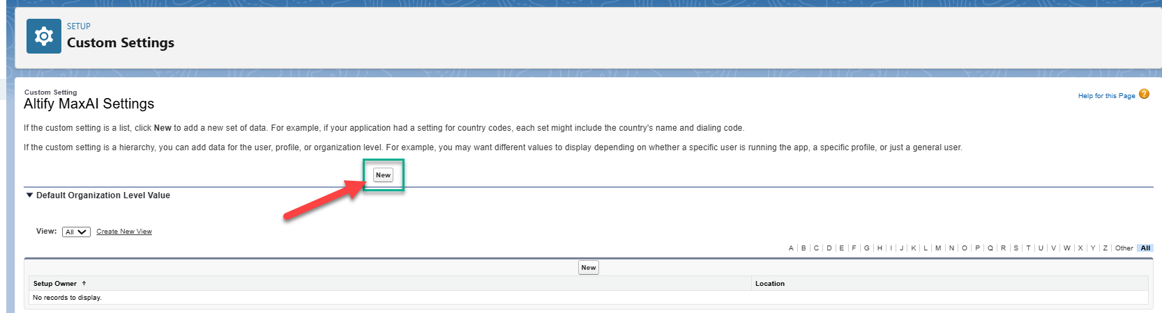 On the Custom Setting page, click New (indicated in the image below) to generate the default settings.