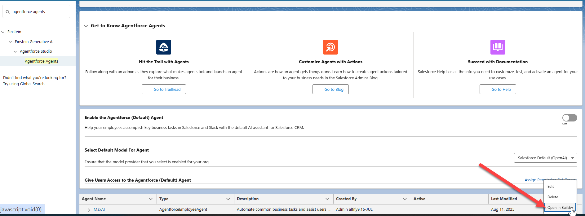 Expand the drop-down menu for the employee agent (as shown in the example below) and select Open in Builder.