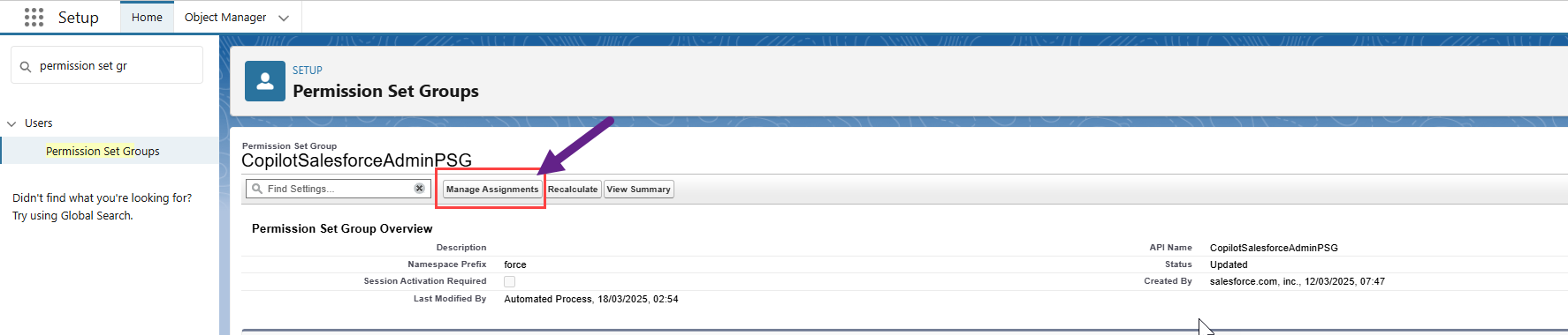 In Setup, find and select Permission Set Groups.