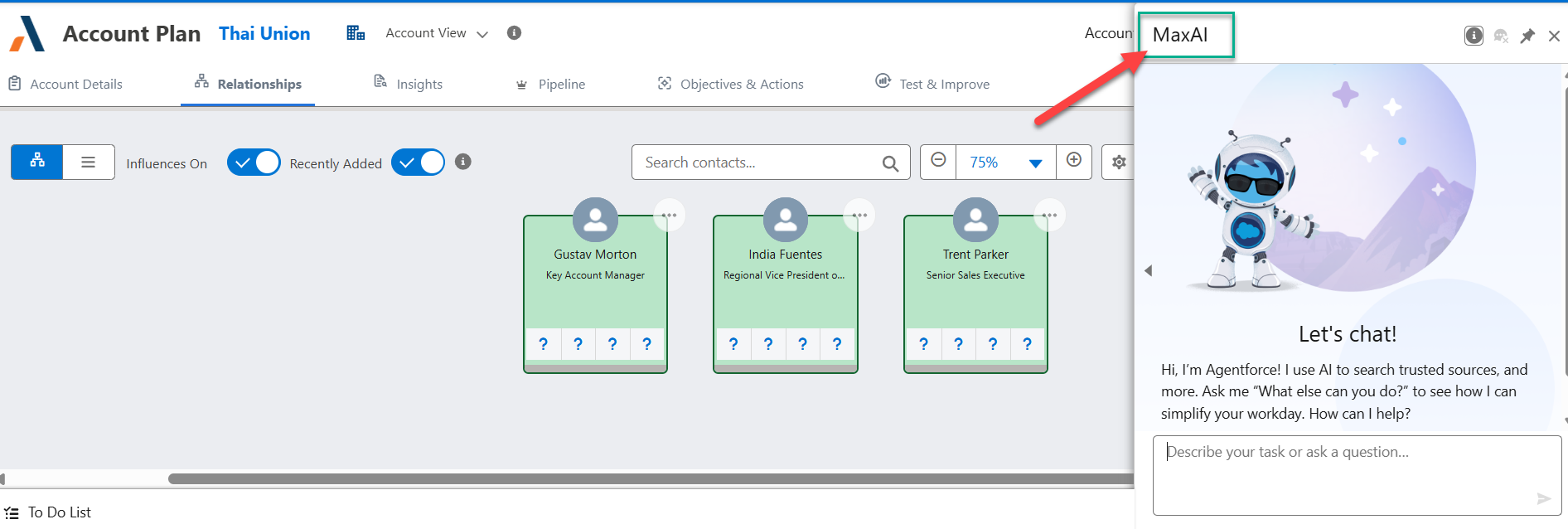 In the example below, assistance is sought with identifying contacts missing from the relationship map for the account Ancaster Engineering.