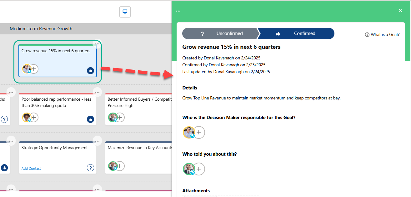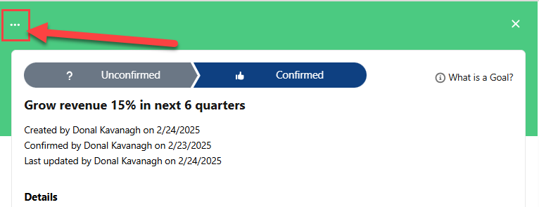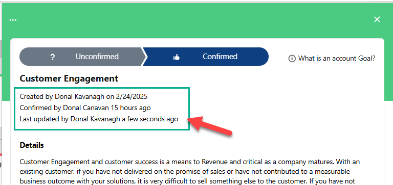 An additional level of validation (e.g. marking a goal as 'Achieved') can be enabled by your administrator. For more information, see Marking Insights as Completed.
