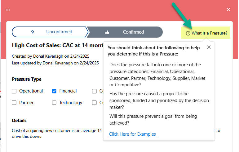 As your understanding of the customer's business issues matures, you can add information to insights using the details panel.