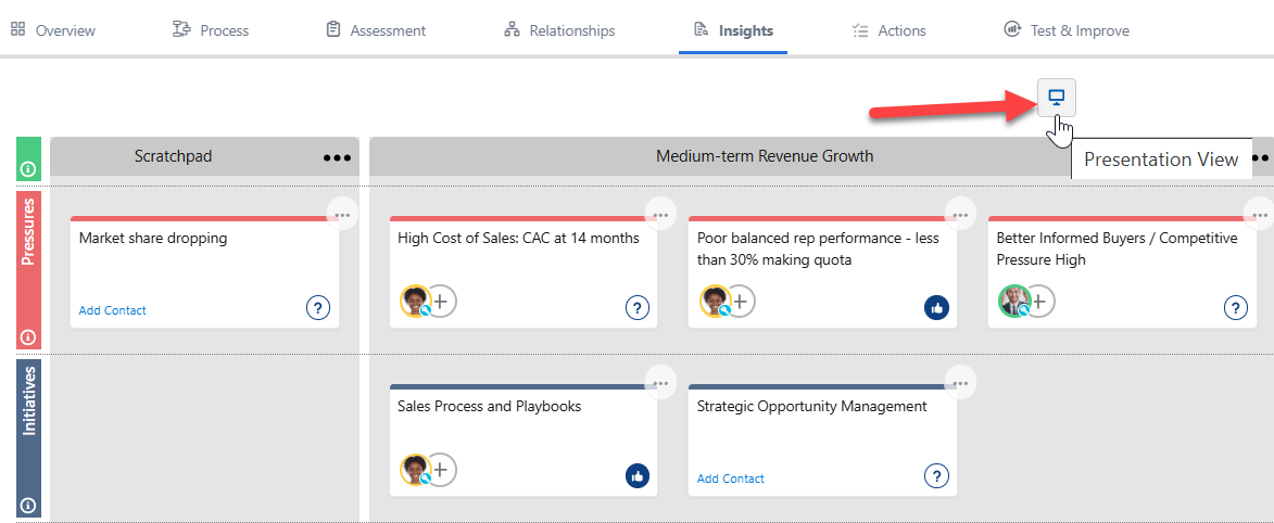 When you're presenting your insight map to the customer, it can be useful to switch to a slideshow view. This has options that help you to prepare for a presentation to the customer (including the generation of a PowerPoint file), and then present the insight map to them sequentially, section by section.