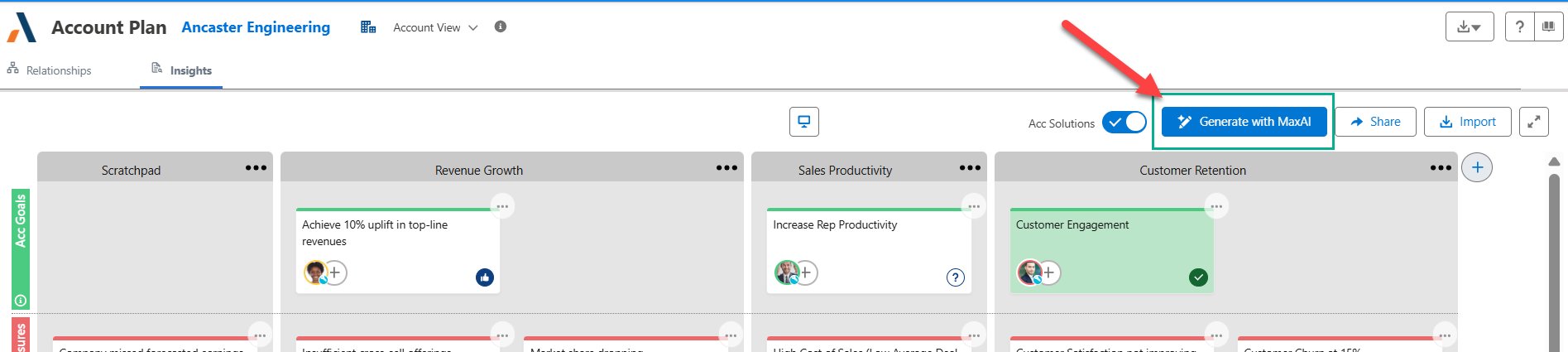 1. On the relevant account or opportunity insight map, click the button Generate with MaxAI (as indicated in the example below).
