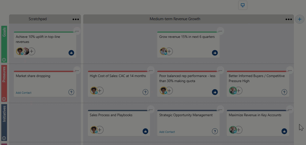 To structure the insights on the insight map into a coherent story about the customer's business issues, you can drag and drop them across (and within) sections and rows.