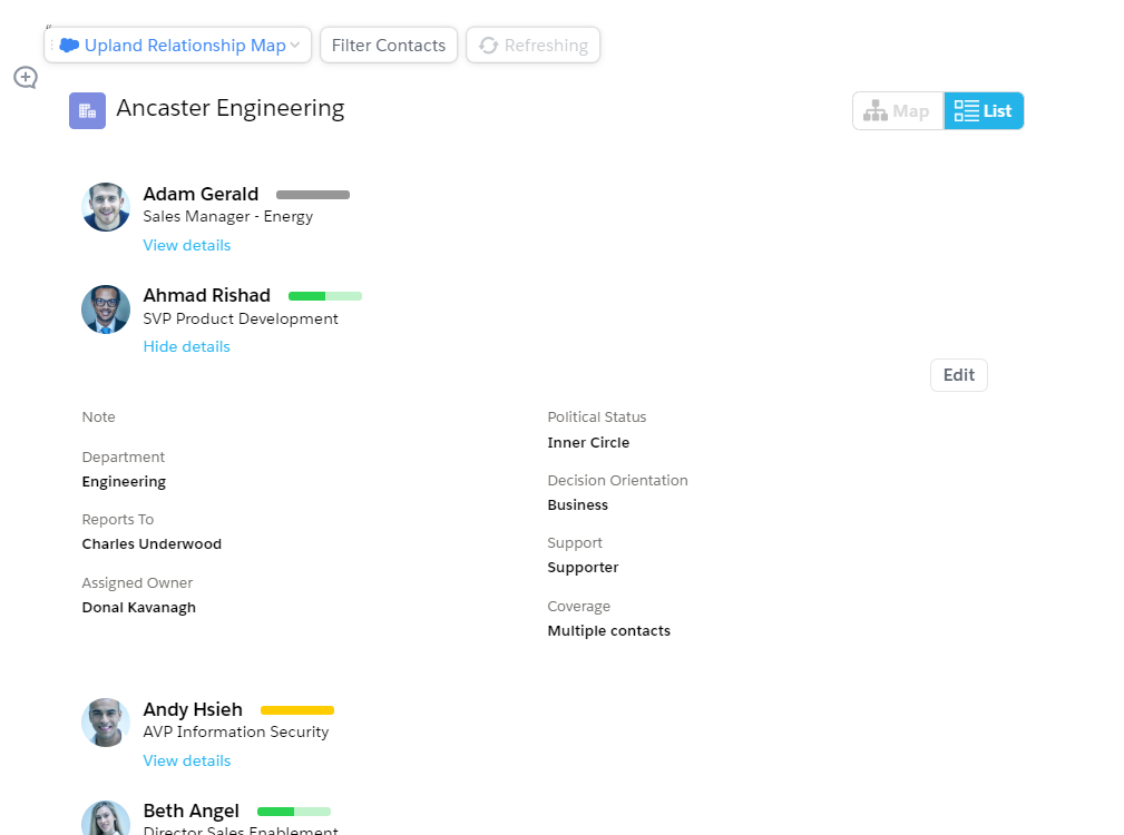 Quip offers two ways of viewing the contacts associated with the relationship map: 'Map View' or 'List View'.