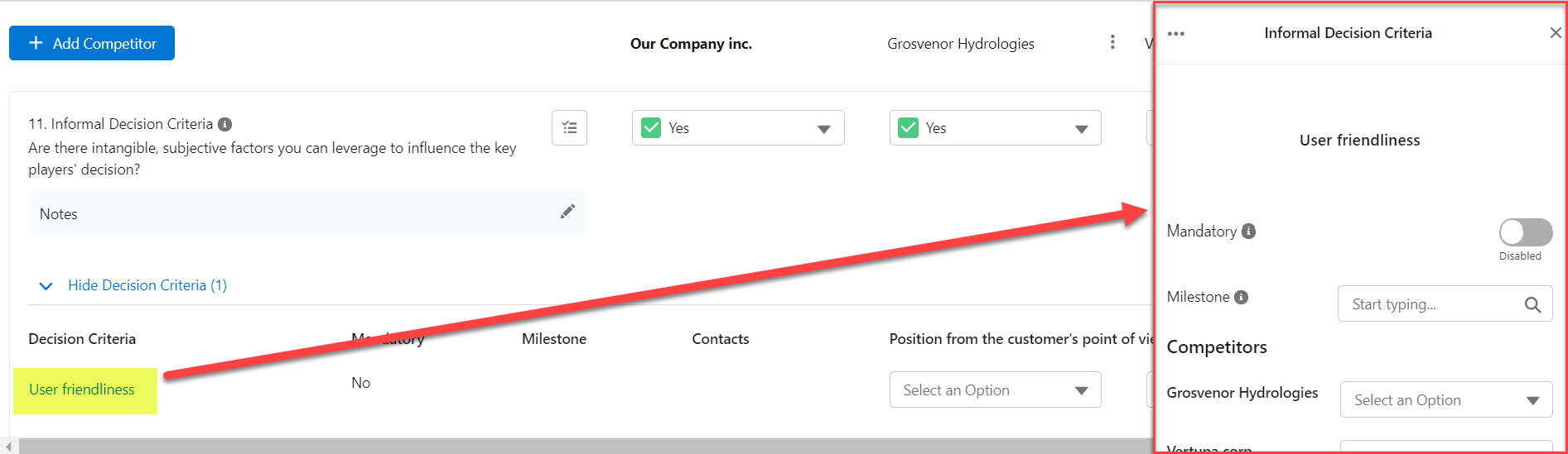 A panel is displayed on the right-hand of the screen (as shown in the example below) where you can add more information about the criterion, such as a contact for whom the criterion is an important consideration.