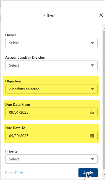 The set of available filters depends on whether you're looking at objectives or the actions list.