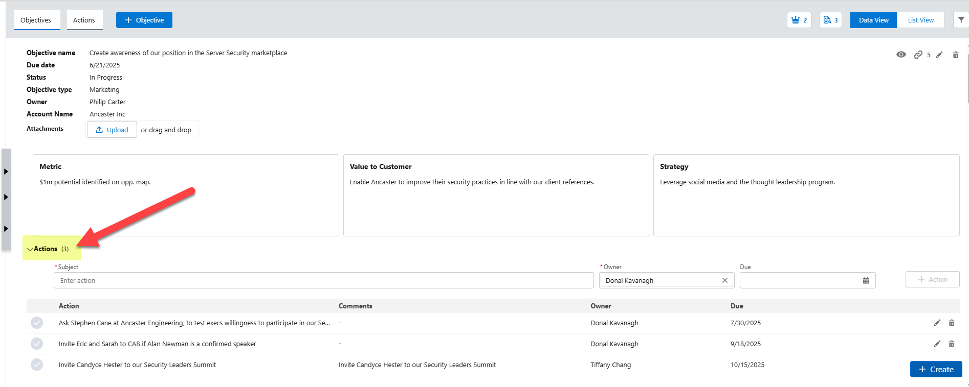 For objectives, click the Actions option (as indicated in the example below) to view any actions that have been created to achieve the accompanying objective.