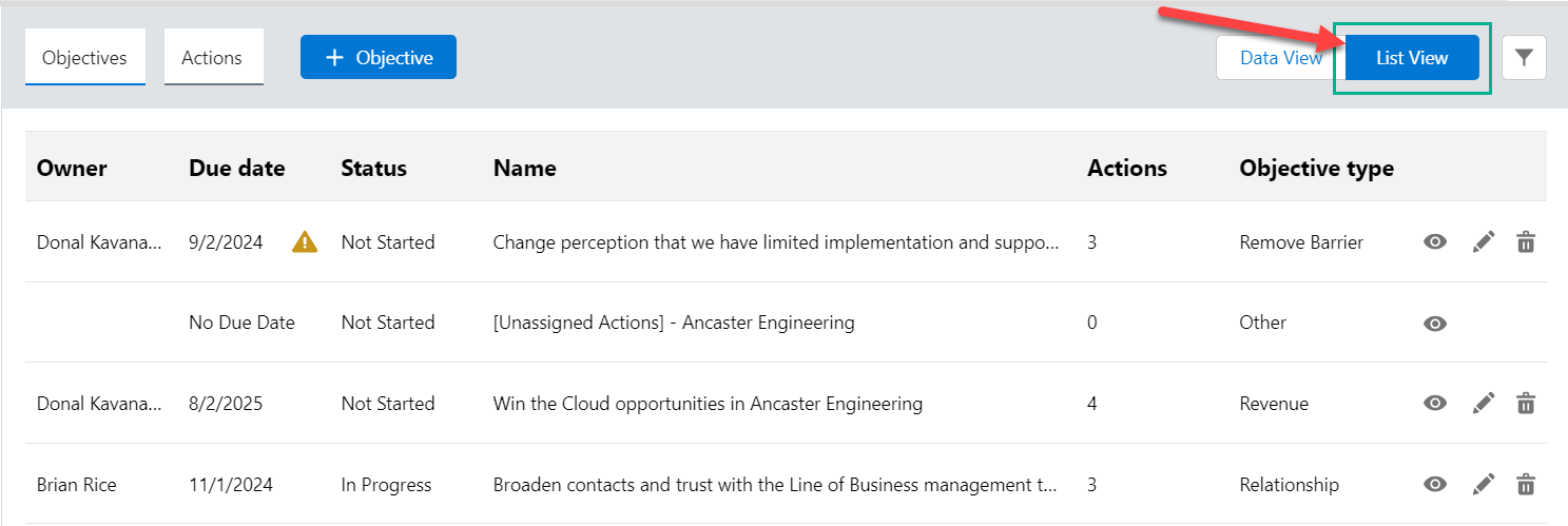 A list view allows you to quickly scan a greater number of objectives or actions (as shown in the example below).