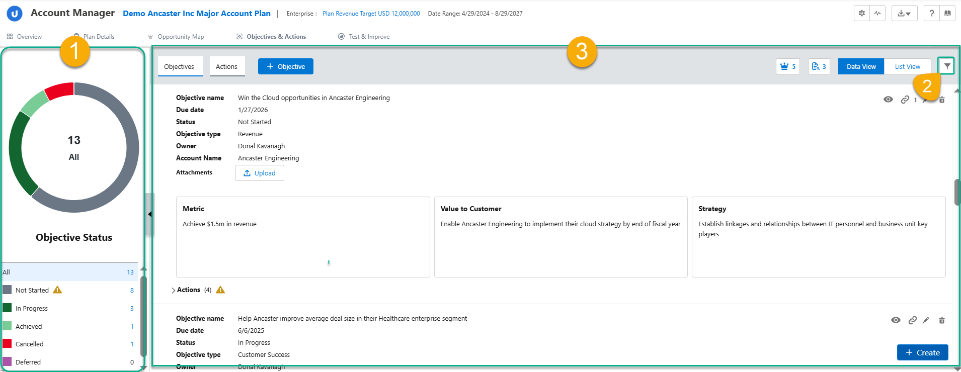 The Objectives & Actions tab is where you execute the Account Manager plan strategy.
