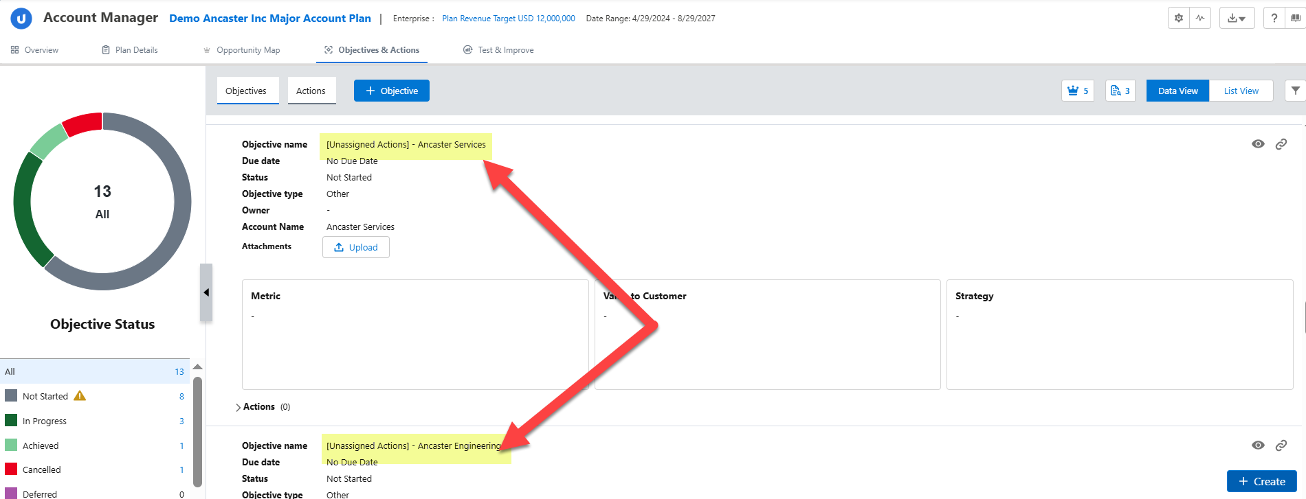 By default, an '[Unassigned Actions]' objective is available for every account in the plan - as shown in the example below.