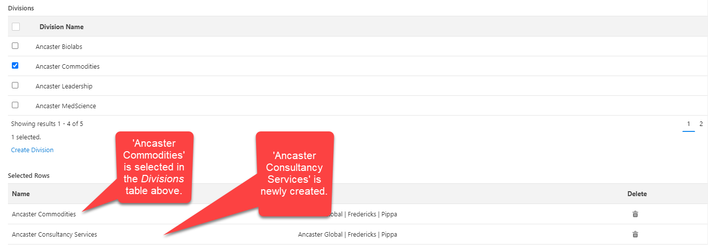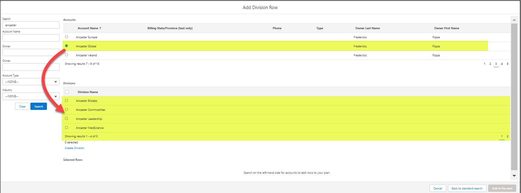 Select an account in the Accounts search results table to see its associated divisions. In the example shown below, 'Ancaster Global' is selected and its three divisions are displayed.
