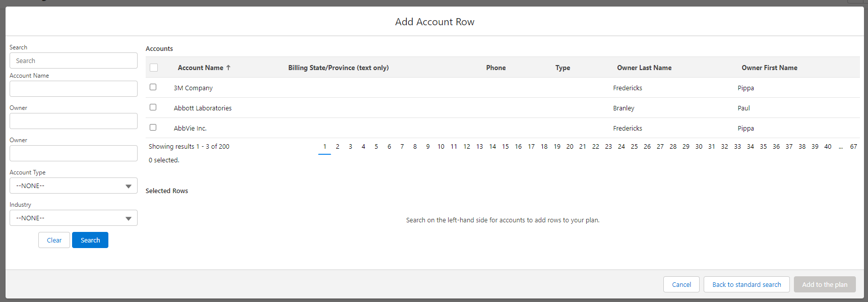 (If you are grouping accounts, the parent account and any child accounts from the Salesforce account hierarchy will automatically appear in the Selected Rows section. Likewise, any accounts you selected in the standard search will appear in the Selected Rows section.)