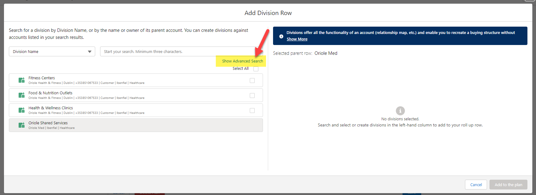 Using the advanced search, you can search for accounts and add their divisions to the roll up, or create a new division against an account in your search results and add it to the roll up.