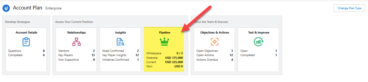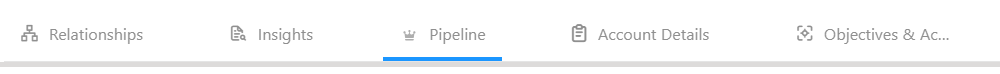 Within an account plan, click the Pipeline tab (selected in the example below) on any page to access the pipeline.