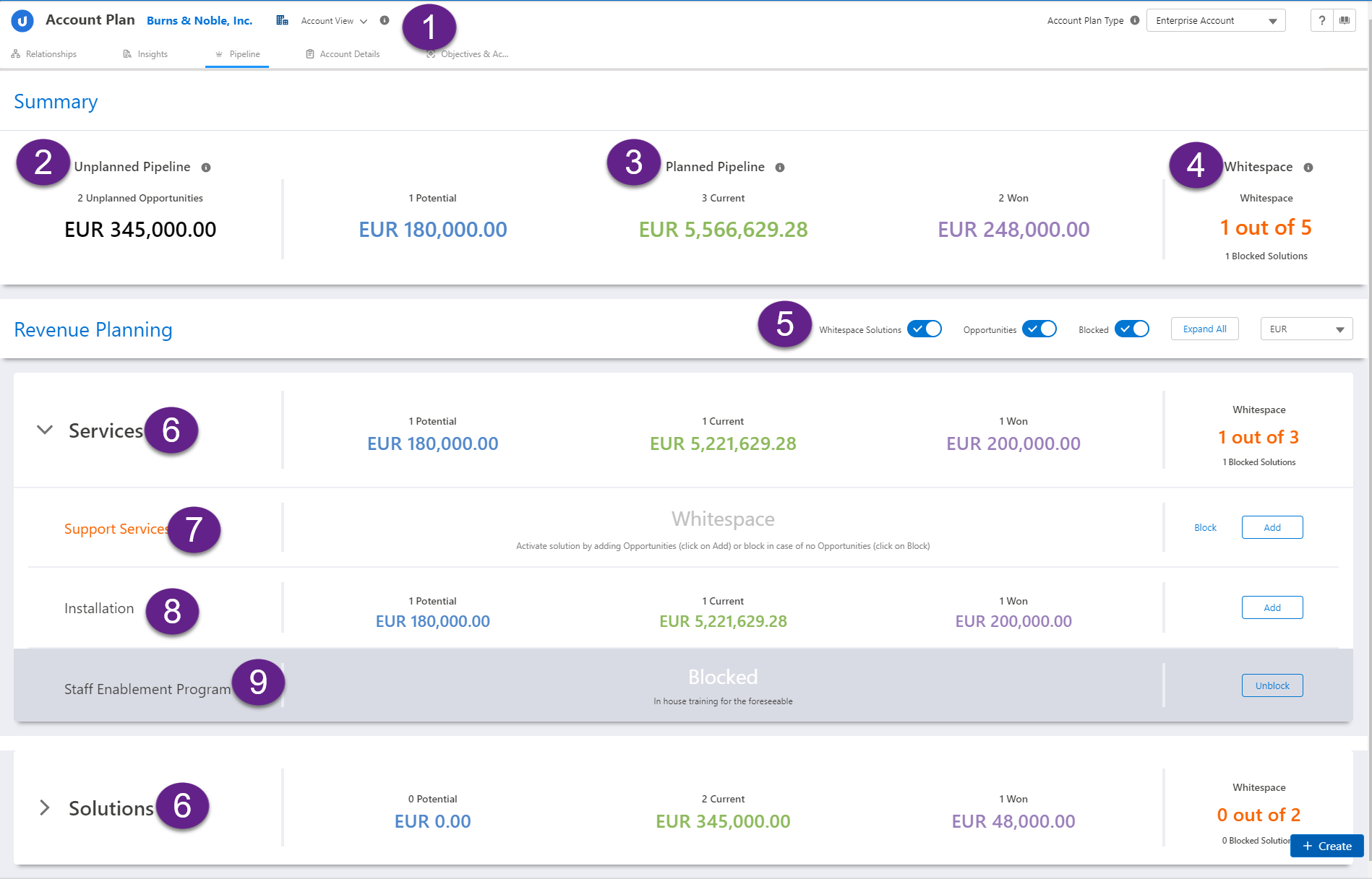 • Example of a solution with planned opportunities (8) - displays the total amounts and numbers of potential, current and won opportunities that are mapped to the solution.