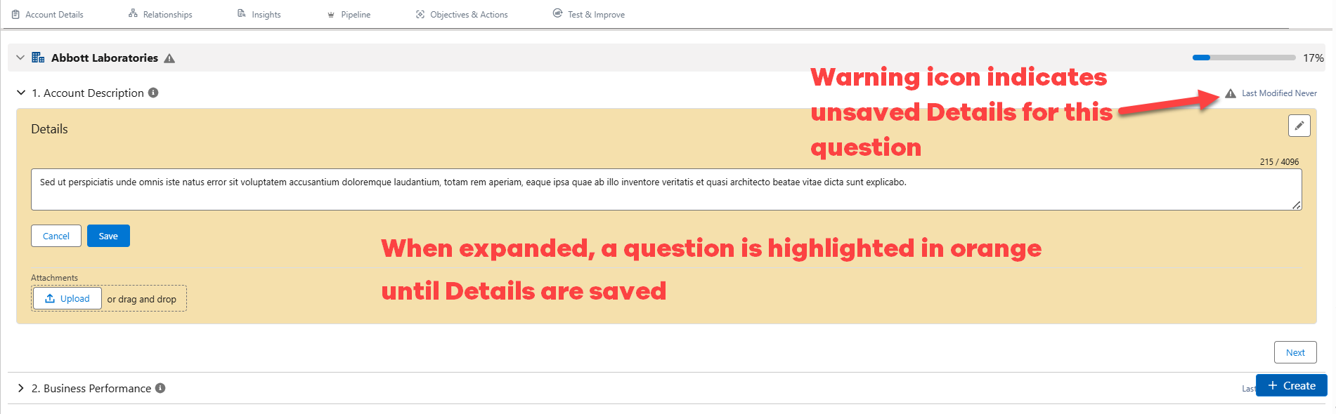 To avoid the accidental loss of data, unsaved account details in an account plan (or row details in an Account Manager plan) are now flagged as follows: