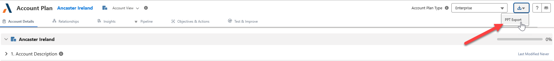 The exporting of account plans to a PowerPoint file is now possible. As with Account Manager plans, the export function is accessed via the Export drop-down in the upper right-hand corner - as indicated in the example below.