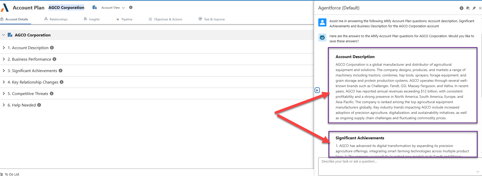 When AI guidance is accessed via the Agentforce chat, its account/row details suggestions are now presented as distinct cards that are easier to discern - as shown in the example below.