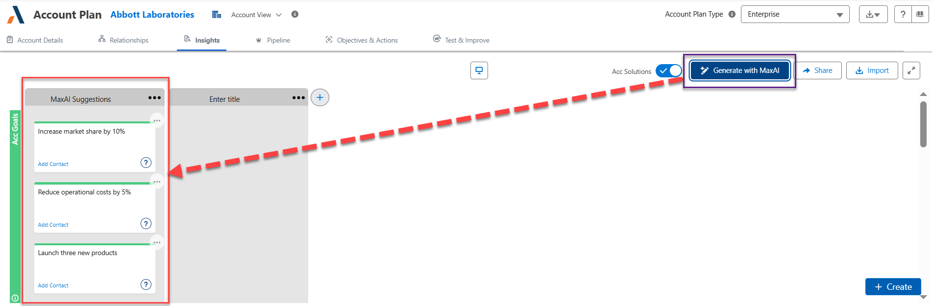 Account or opportunity insight map: click the Generate with MaxAI button to generate a section of suggested insights - as shown in the example below.