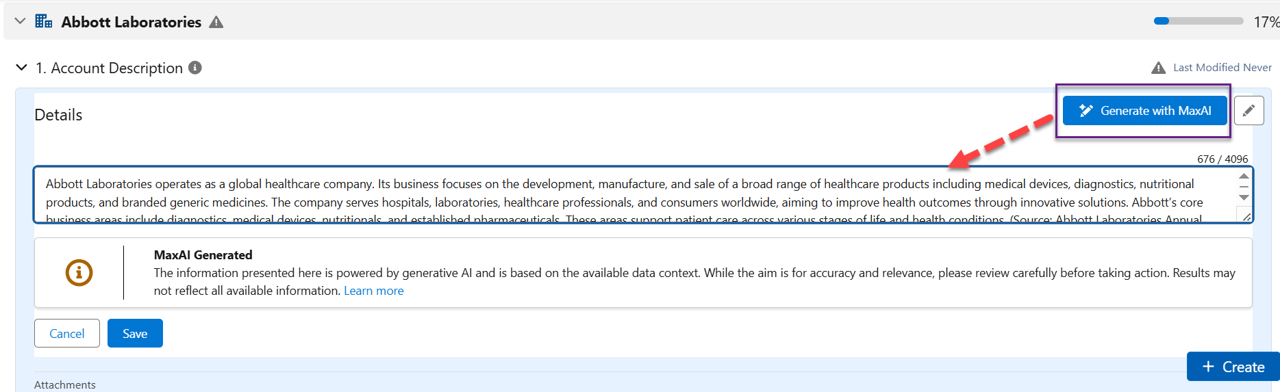Account details of an account plan (or row details of an Account Manager plan): click the Generate with MaxAI button to generate a suggested answer for the accompanying question - as shown in the example below.