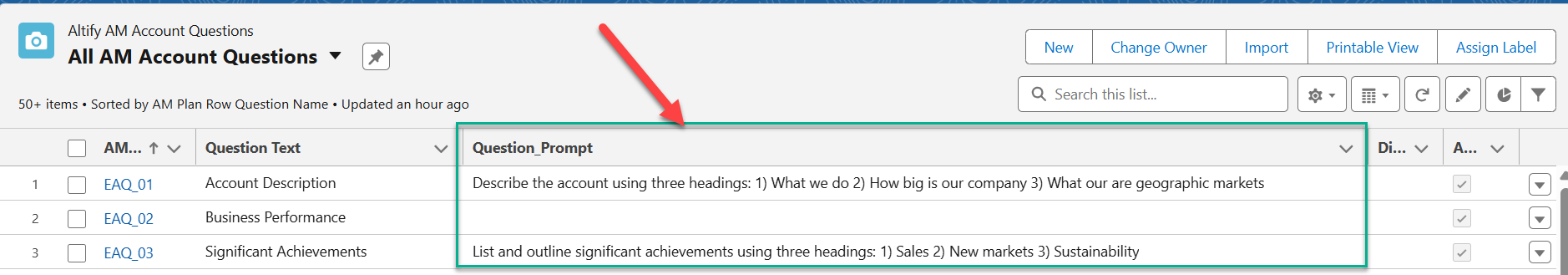 Tip: Altify recommends that you add the field Question_Prompt to your Altify AM Account Questions list view so that you have an overview of the prompts that have been added.