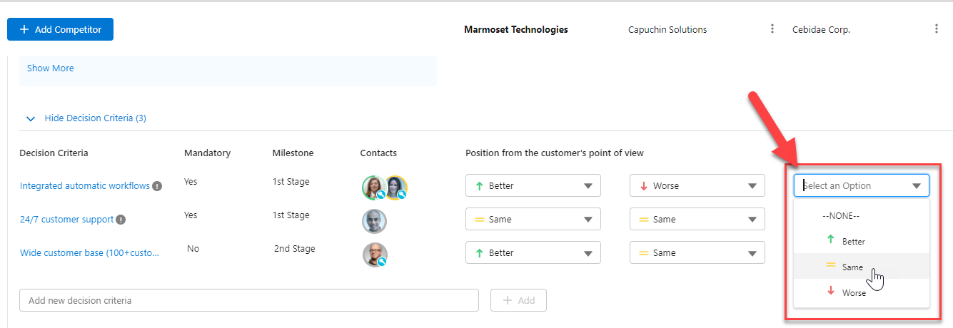 You can adjust how your organization, and your competitors, rate against each criterion using inline editing - as shown below.