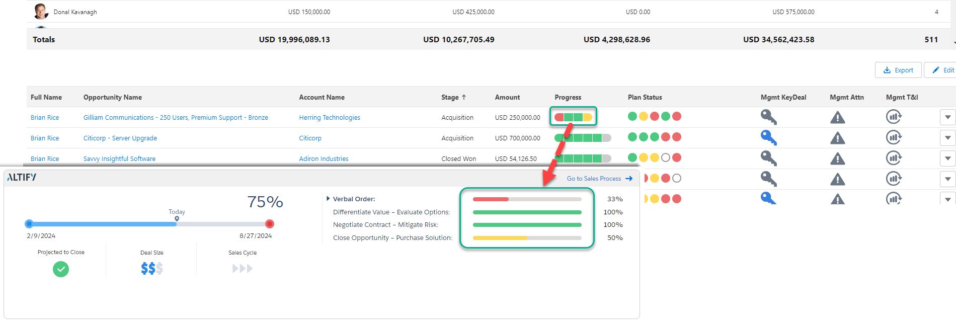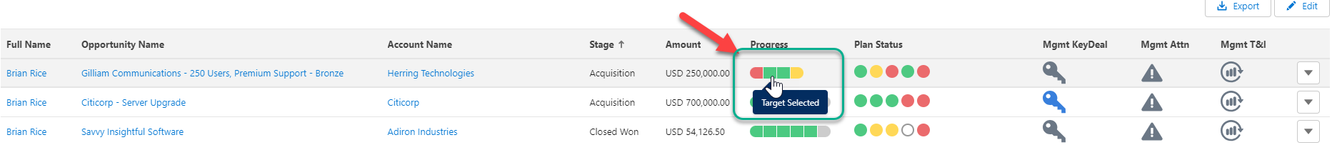 In the example below you can see how the segments of the Progress bar in TeamView reflect the current state of the sales process qualifiers in the sales process: