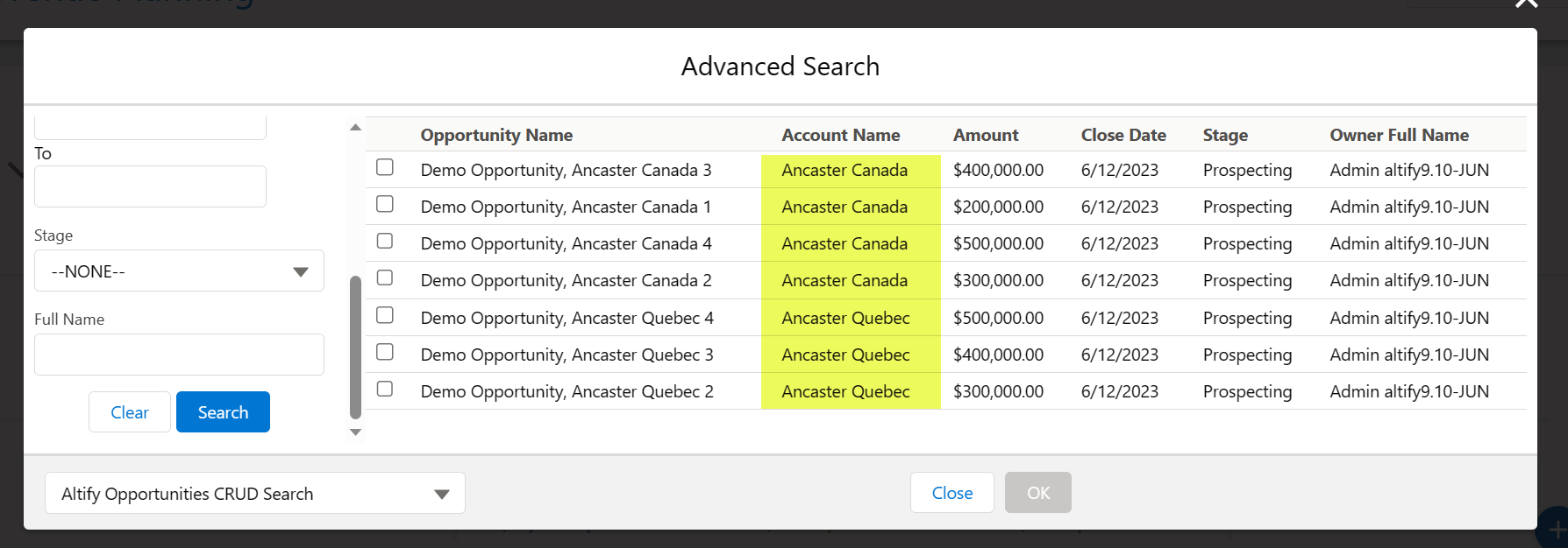 In the example below, a user is importing opportunities into the 'Ancaster Canada' account plan. With the custom setting activated, opportunities belonging to the 'Ancaster Quebec' account (a child of the 'Ancaster Canada' account) are available for import.