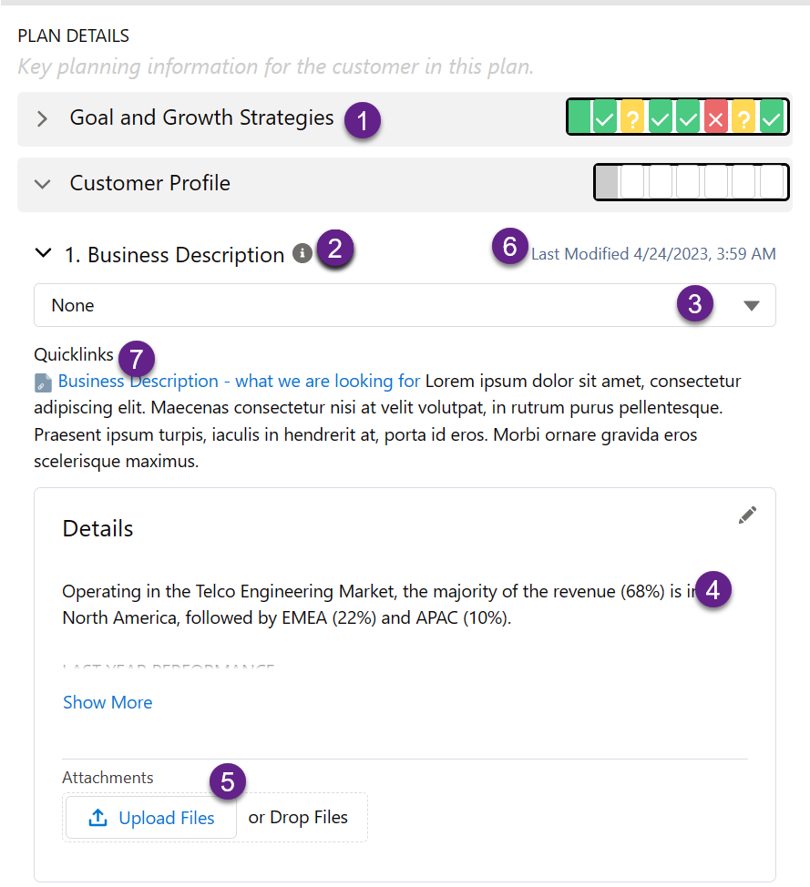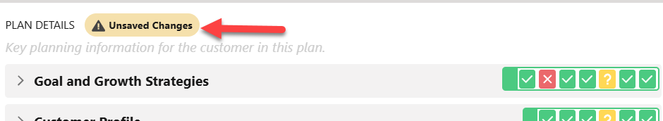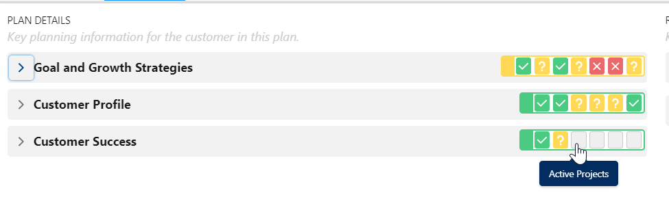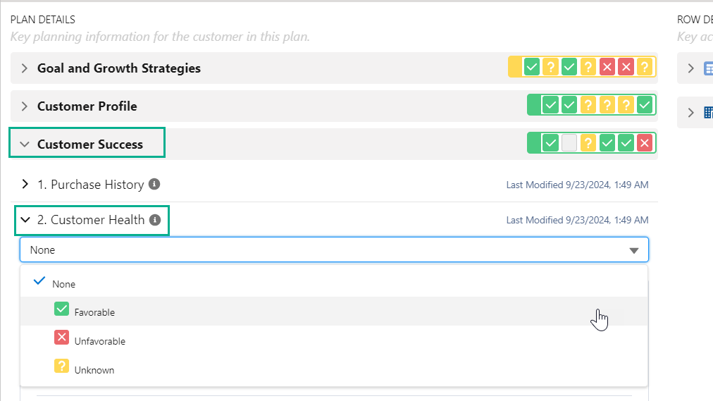 To answer a plan details question, expand the relevant section (such as 'Customer Success' indicated below), expand the relevant question (e.g. 'Customer Health' in the image below), and then select your answer from the drop-down menu of options ('Favorable', 'Unfavorable' and 'Unknown' in the image below)..