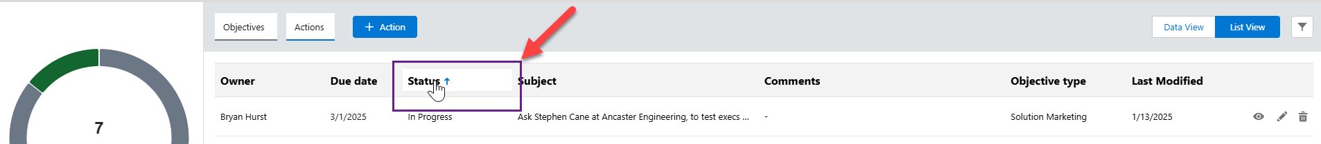Another way to arrange the data on the Objectives or Actions page is to sort them by column header - as shown in the example below where actions are currently sorted by Status. You can only do this in the list view.