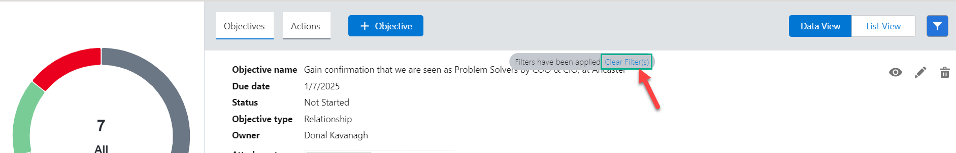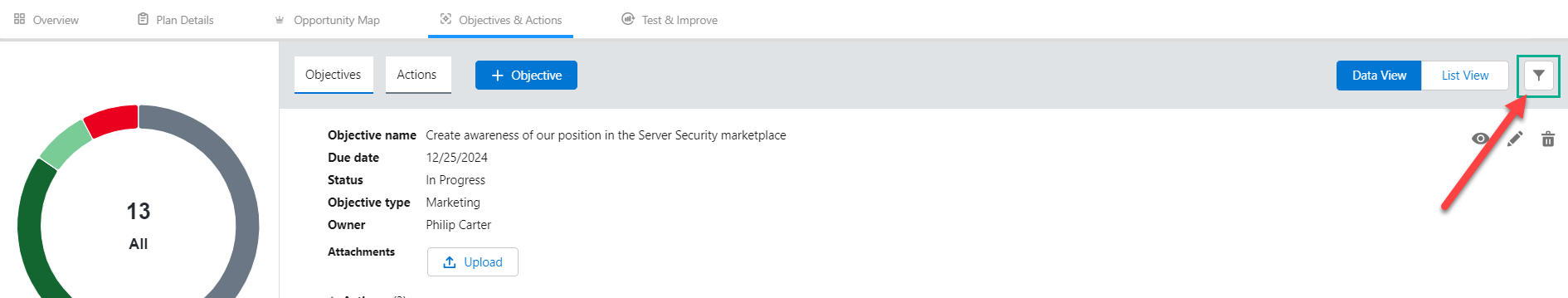Tip: you can select a segment of the donut chart while a filter is enabled to further filter the objectives/actions by their status.