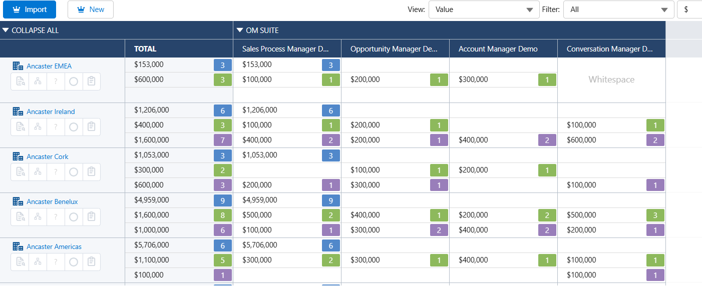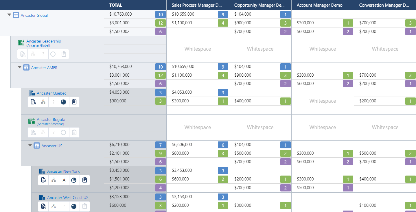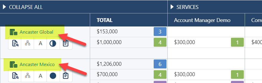 Roll up rows such as 'Ancaster Global' in the example below can be expanded to show its account and division rows, and any child and grandchild roll ups that it may contain (a maximum of three levels of roll up is allowed, e.g. 'Ancaster Global' > 'Ancaster AMER' > 'Ancaster US').