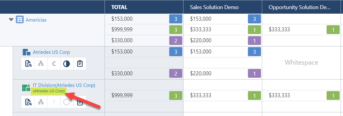 The Ancaster AMER roll up totals the opportunities for the 'Ancaster Quebec' account, the 'Ancaster Bogota' division and the 'Ancaster US' roll up.