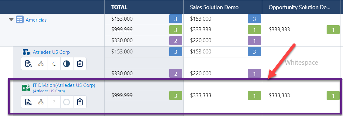 On the opportunity map, each row represents one of the accounts or account divisions included in your Account Manager plan, or a roll up that provides sub totals of the account and division rows it contains.