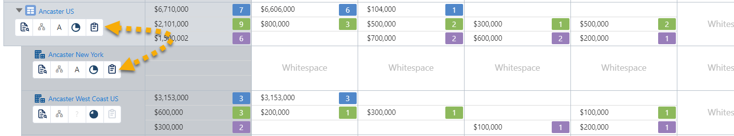 Account and division rows (and potentially roll up rows) include several options to record and access additional information.