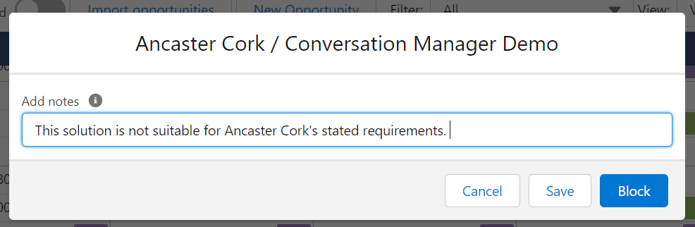 In the example shown below, the solution 'Opportunity Manager Demo' is blocked for the account 'Ancaster East Coast US'.