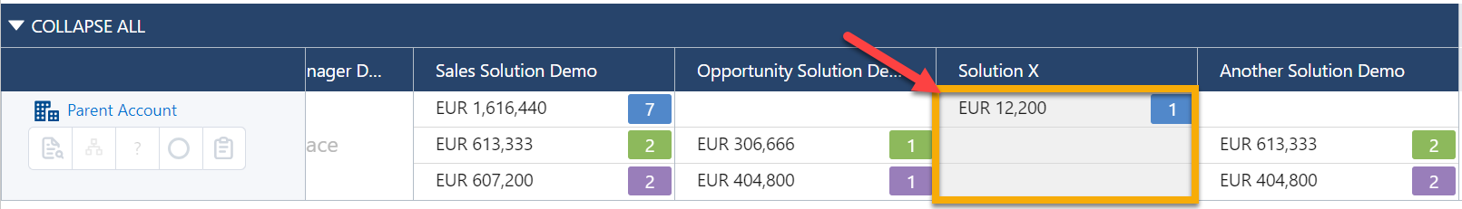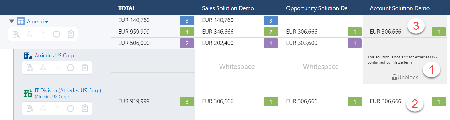 If a block is placed on the Atriedes US Corp row (see 1 in the image below), opportunity values for other rows in the roll up (2) continue to be displayed on the roll up row (3). The block on the nominated row (Atriedes US Corp) is indicated by gray shading on the roll up.