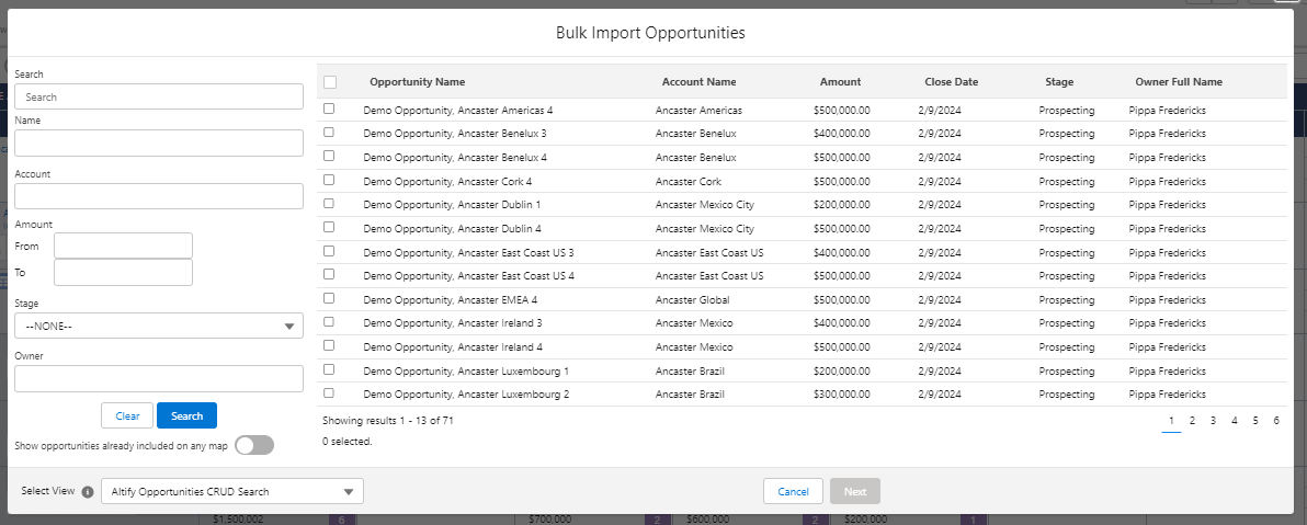 The Bulk Import Opportunities dialog opens. This lists all current and won opportunities belonging to any accounts associated with the plan (including those grouped by Salesforce hierarchy or by Altify account grouping). By default, opportunities that are already included in the map are not displayed.