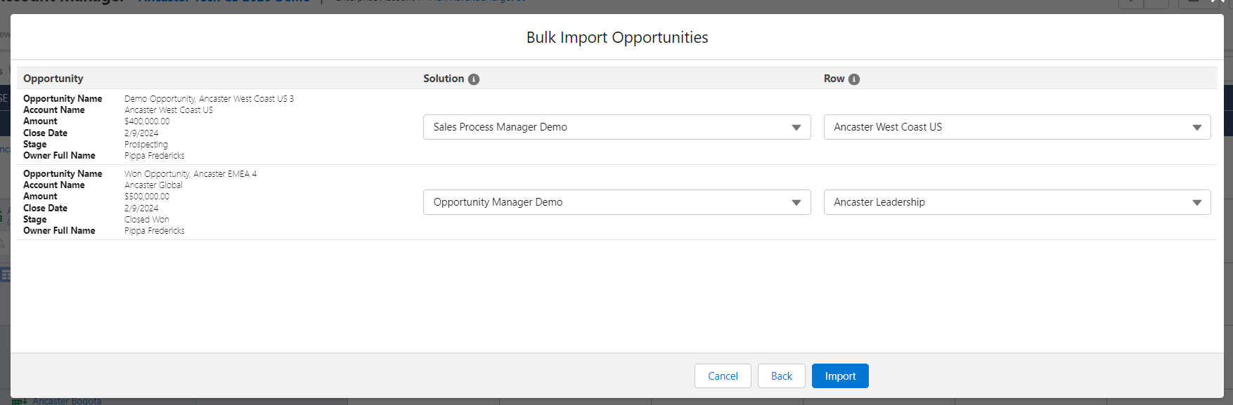 More refined import options are available when you import opportunities via an opportunity map intersection. To import current or won opportunities for a specific account/division and solution, see Add Current or Won Opportunities to an Intersection.