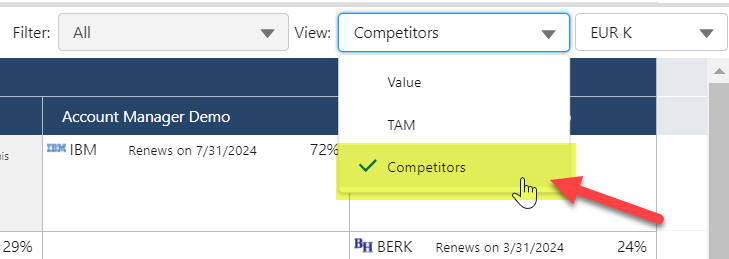 For each TAM, the percentages held by your top two competitors are shown. See, for example, 'RAKU' with 21% and 'PHIS' with 12% indicated in the image below (1). If provided, the contract renewal date for the two leading competitors are also included.