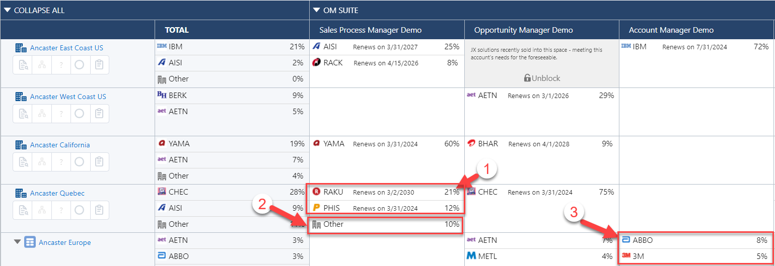 For an intersection on a roll up row (see 3 below, for example), the percentages represent the competitors' market share of the accumulated TAM of the account and division rows within the roll up.